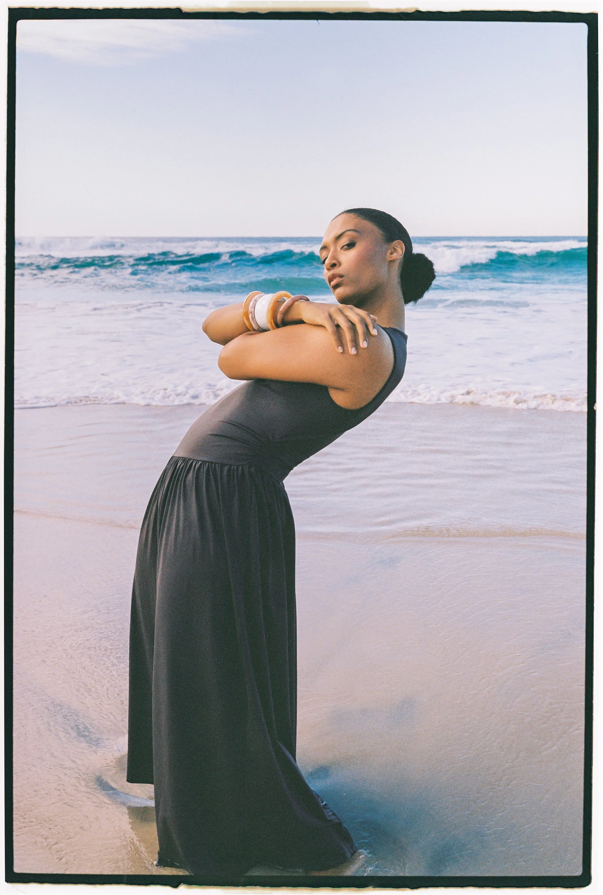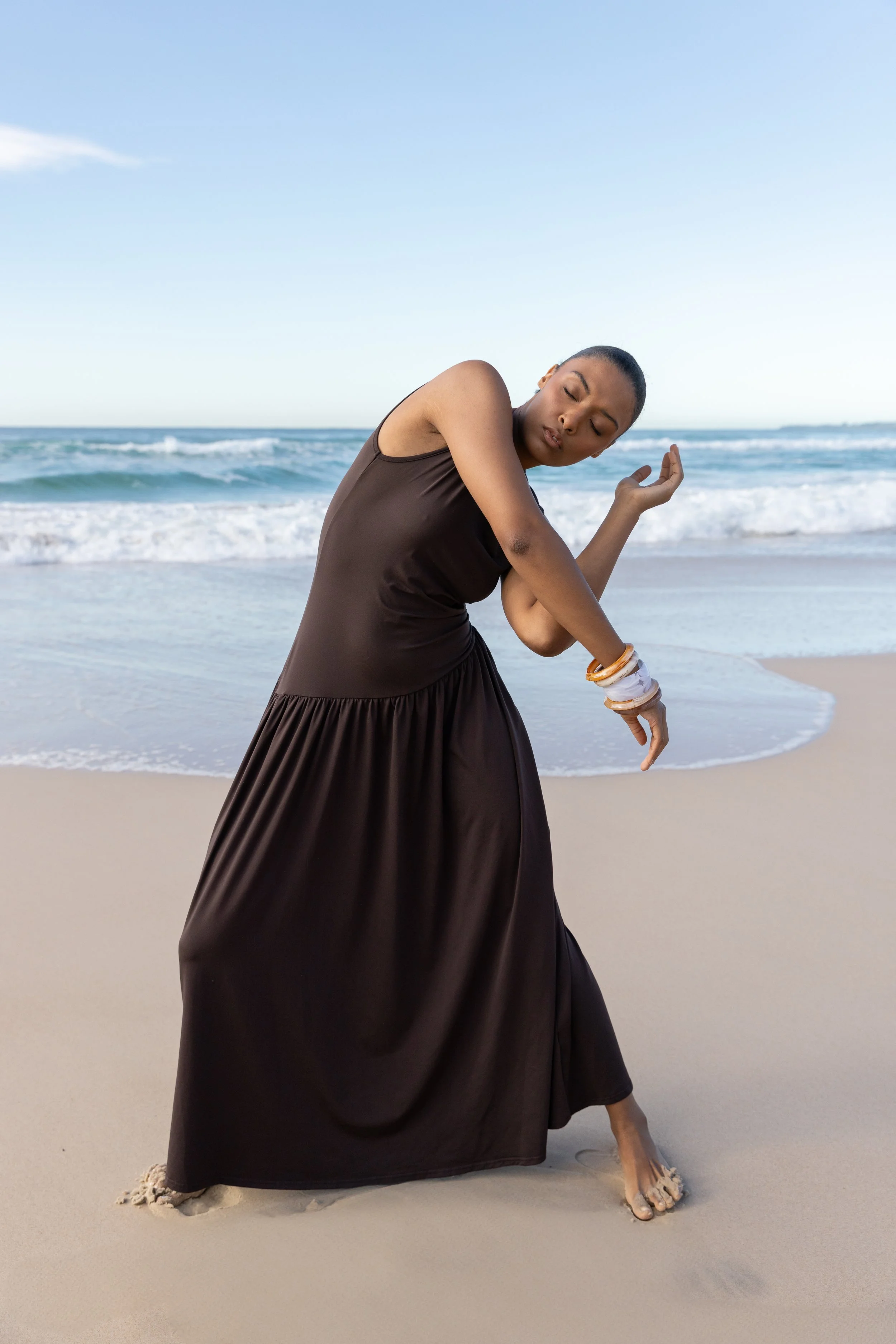 A woman with platinum blonde hair in a black strapless dress sitting on a white sandy beach, leaning back on her hands with her head tilted upwards and eyes closed. View fullsize