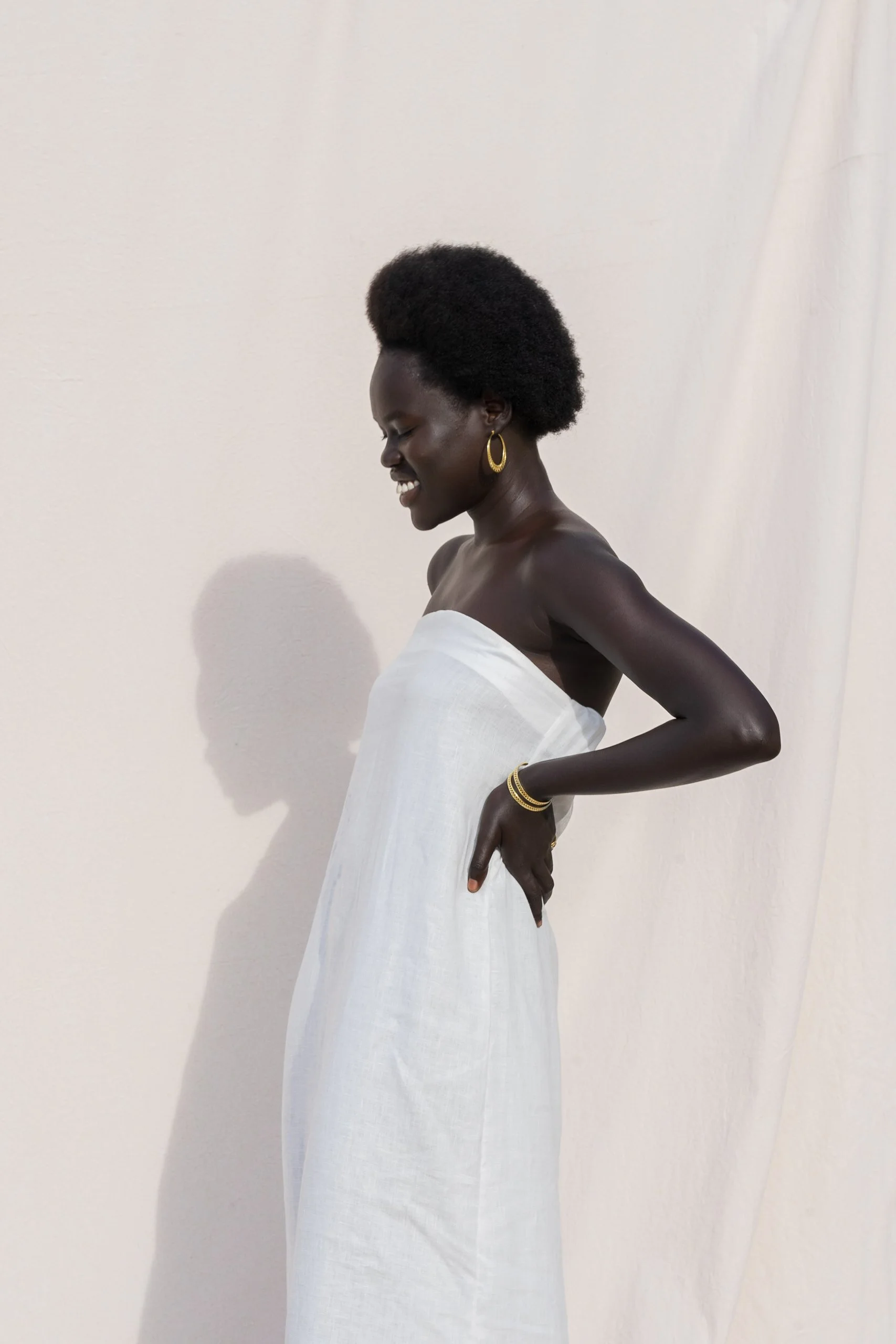 Woman in off-shoulder cream-colored dress, reclining on white fabric, against a white draped background.